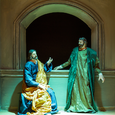Hier im Bild begegnet Jesus Nikodemus, einem Pharisäer und einflussreichen Juden. Nikodemus kann Jesu Worte nicht verstehen; dennoch prägt ihn die Begegnung. Nach dem Tod Jesu ist er es, der sich im Hohen Rat für eine ehrenvolle Bestattung von Jesus einsetzt.